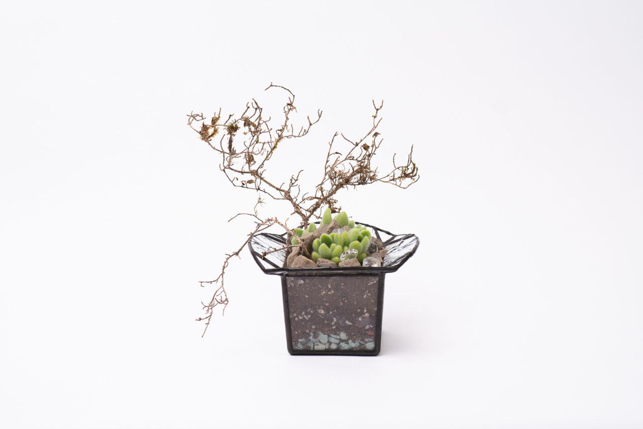 貓毛信東尼給人一種細緻的寵物感,可以跟他互動,可以看他成長,我們選了台灣盆器設計師璃光之間的玻璃鑲嵌盆來承裝這珍貴的物種,再以粗獷的岩石、木枝條點綴,再加上一點透明的晶石,不只是在原生地,更像是在外太空的隕石坑的奇特植物。柔軟的毛對上堅硬的石塊、方盆中間的圓形、乾枝與多肉,多層次的反差對比。